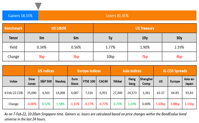US NFP came at 467k for January, much higher than the 125k print forecasted. The unemployment rate rose to 4% from 3.9%. FT notes that trading on credit default swaps (CDS) (Term of the Day, explained below) for protection from junk-rated companies defaulting has jumped to $197bn in January, up from $123bn in December, and is among the highest since the pandemic began in March 2020. Despite a positive economic backdrop, the credit cycle has turned due to the impetus for the Fed to tighten monetary policy according to Viktor Hjort, global head of credit strategy at BNP Paribas.