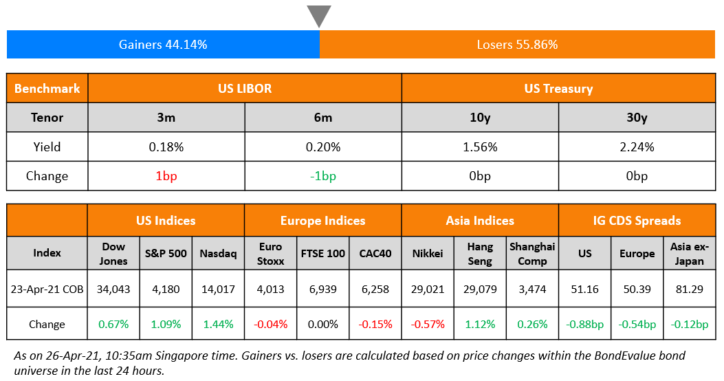 S&P and Nasdaq rallied 1.1% and 1.4% on Friday as equities recovered some its losses from earlier in the week. US Markit Flash Manufacturing PMI came in at 60.6, the highest since 2007. US 10Y Treasury yields were stable at 1.56%. This week sees popular names like Tesla, Apple, Google etc. report earnings besides the FOMC’s meeting on Wednesday European equities were weaker with the DAX and CAC down 0.3% and 0.2% respectively while FTSE was unchanged. US IG CDS spreads tightened 0.9bp while HY tightened 4.7bp. EU main CDS spreads were 0.5bp tighter and crossover spreads tightened 3.5bp. Asian equity markets are up 0.7% today and Asia ex-Japan CDS spreads flattened 0.1bp.
