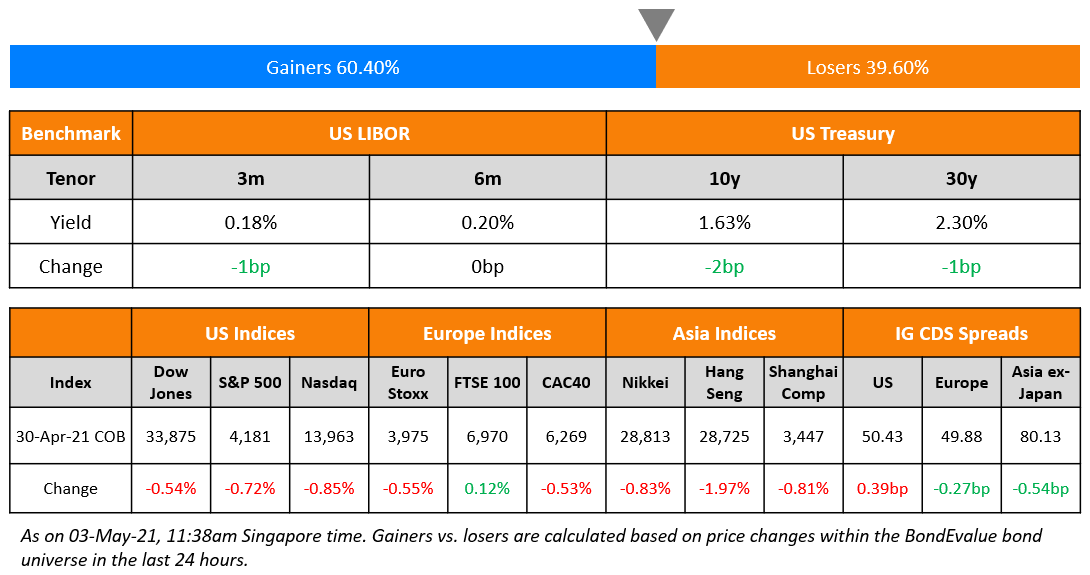 US primary market issuances fell to $19.2bn, down 30.7% vs. $27.7bn priced in the week prior. The drop in issuance can be attributed to both IG and HY issuances. IG new bond deals stood at $13.2bn vs. $18.3bn in the prior week while HY new bond deals were at $5.95bn vs. $9bn in the prior week. The largest deals in the IG space were led by Citi’s $5.5bn three-trancher followed by Coca-Cola’s $3.45bn issuance. In the HY space, CSC Holdings raised $2bn followed by MSCI’s $600mn deal. In North America, there were a total of 47 upgrades and 48 downgrades combined across the three major rating agencies last week. LatAm saw $2bn in new bond deals last week vs. $4.2bn in the week prior with Natura Cosmeticos alone raising $1bn. EU Corporate G3 issuance saw a sharp decrease last week to $13bn vs. $28.4bn in the week prior – issuances were led by Credit Mutuel’s €1.25bn and KfW’s €1bn issuances. Across the European region, there were 39 upgrades and 23 downgrades across the three major rating agencies. GCC and Sukuk G3 issuances were at $1.75bn vs. $2.3bn in the week prior with Abu Dhabi Ports’ and Oman’s OQ SAOC raising $1bn and $750mn via new bonds. Across the Middle East & Africa region, there were 2 upgrades and 8 downgrades across the three major rating agencies. APAC ex-Japan G3 issuances decreased sharply to $5.4bn vs. $18.3bn in the prior week led by Australia’s NBN raising $2bn followed by Kookmin Bank and Kaisa’s $500mn issuances. In the Asia ex-Japan region, there were 7 upgrades and 19 downgrades combined across the three major rating agencies last week.