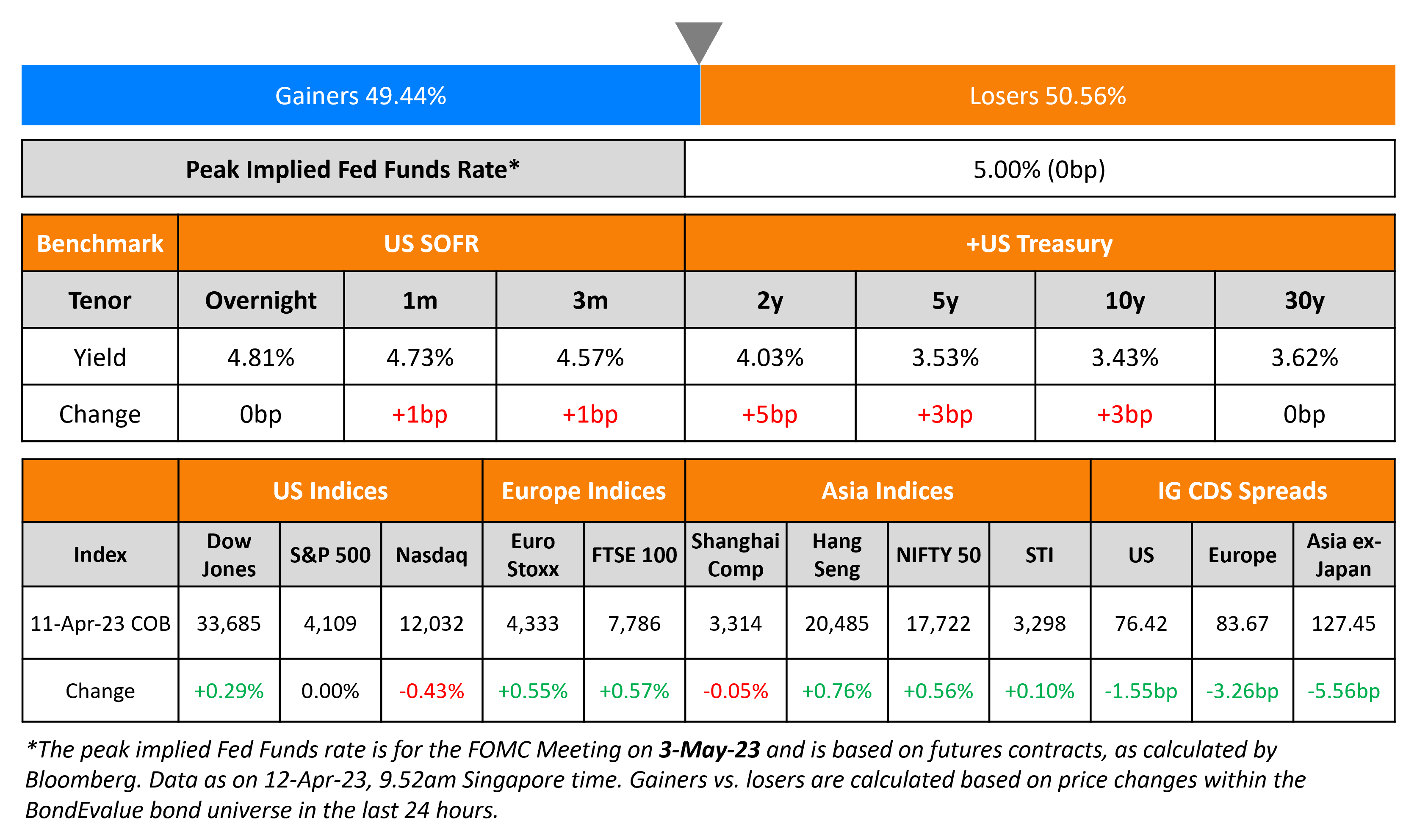US Treasury yields continued to tick slightly higher yesterday by 3-5bp with markets awaiting the CPI print today. The 2Y yield is now back above the 4%-mark since going below the level at end-March. The peak fed funds was unchanged at 5%. US CPI YoY is expected to come at 5.1% and Core CPI is expected at 5.6%. The probability of a 25bp rate hike in the May meeting stayed almost unchanged at 70% as per the CME’s maximum probabilities. US IG and HY CDS spreads tightened 1.6bp and 7.9bp respectively. US equity indices continued to stay rangebound as the S&P ended flat and Nasdaq ended 0.4% lower. The IMF trimmed its global growth forecasts for the year taking into account the banking failures of SVB and Signature Bank, and the forced sale of Credit Suisse. Its real GDP forecast is now for a 2.8% expansion in 2023 and 3% in 2024, revised downwards by 0.1% since January. This comes after the global economy grew 3.4% in 2022.