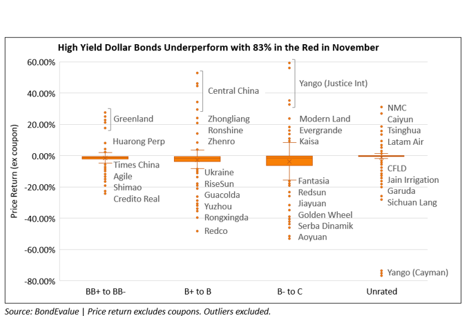 November was the third consecutive month where over 70% of dollar bonds in our universe ended the month lower. 72% of dollar bonds delivered a negative price return ex-coupon in November, continuing the woes from October and September where 81% and 86% of the bonds were in the red respectively. This comes after June, July and August that saw 54%, 52% and 47% of dollar bonds trading up in the months, respectively. Both investment grade (IG) and high yield (HY) bonds performed poorly, with 65% and 83% of the bonds in the red respectively. However, unlike the previous two months, in November, HY bonds fared worse than IG bonds – in September and October 78% and 75% of HY bonds saw negative returns as compared to 92% and 86% of IG bonds that saw negative returns.