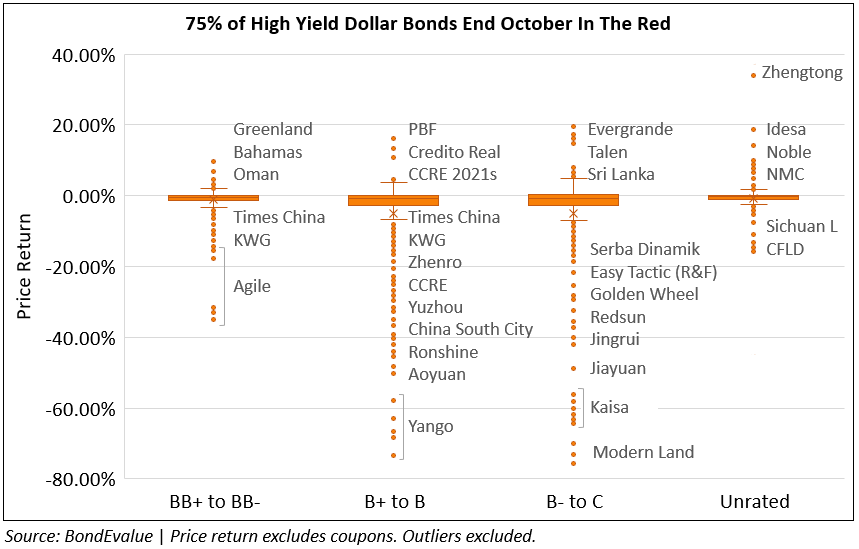High yield bonds had a somber month as well with 75% of junk dollar bonds in our universe ending lower in October. The losers were once again dominated by Chinese real estate developers, whose bonds sold-off after Fantasia and Modern Land defaulted on their dollar bonds. However, Evergrande and Greenland were outliers – Evergrande’s bonds recovered some of the losses from the previous months after it managed to make payments on two of its dollar bonds within the grace period. Greenland on the other hand reported promising Q3 results where revenues rose 30% to RMB 144.1bn ($22.6bn) with the developer saying that it will soon meet the ‘net-debt to equity’ metric among China’s three-red lines ratios. For more on the gainers and losers, scroll down.