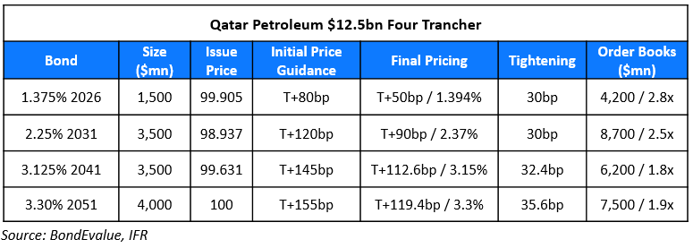 Qatar’s state-owned Qatar Petroleum (QP) raised $12.5bn via a jumbo four-tranche bond offering that includes a 30Y Formosa bond. The four-part issuance is the first by the world’s top liquefied natural gas (LNG) supplier. This is also the largest deal in APAC and Middle East since the Saudi Government issued a three-trancher worth $12.5bn in September 2017.