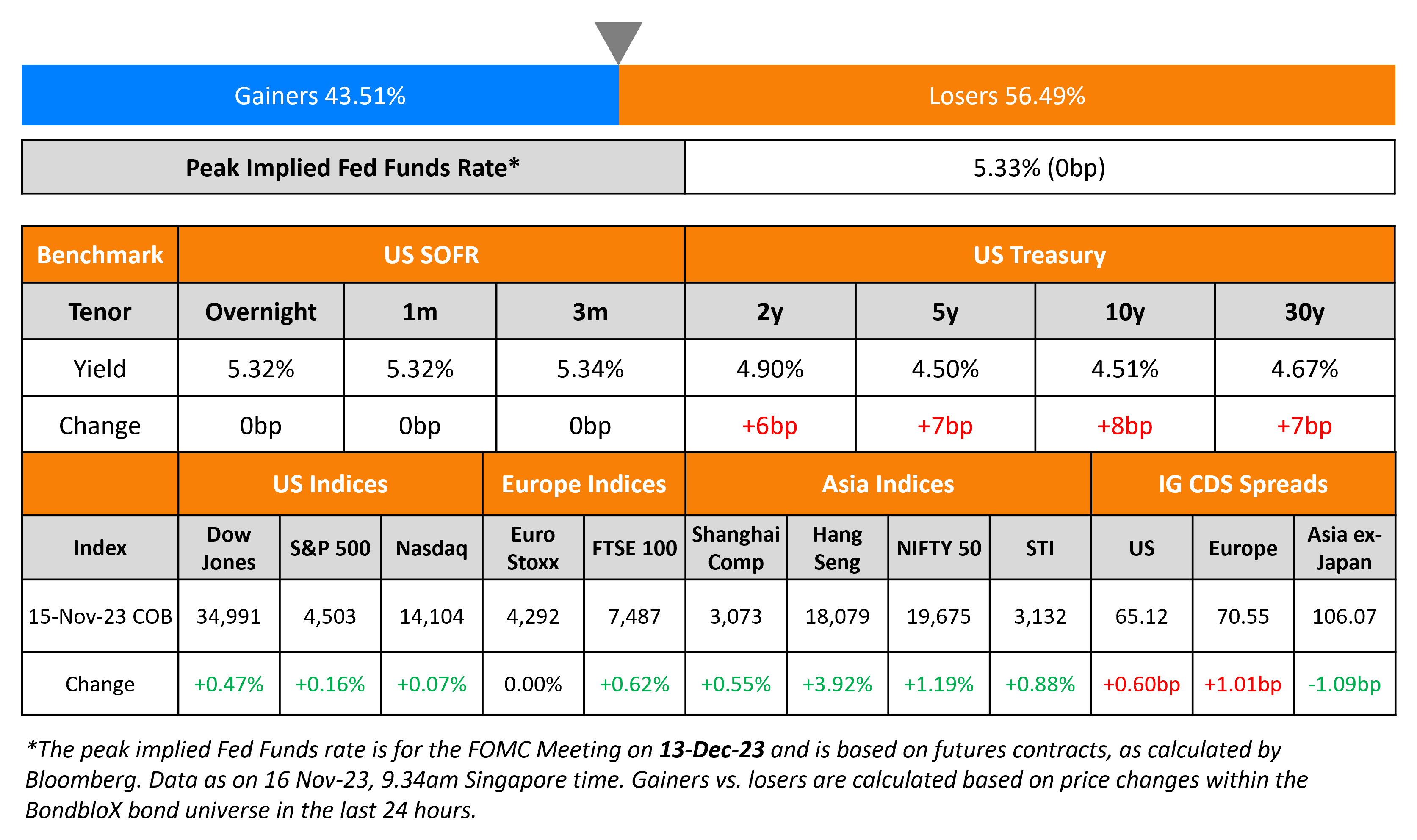 US Treasury yields moved higher by 6-7bp across the curve on Wednesday, after having dropped by more than 20bp a day prior. US Retail Sales fell for the first time in seven months, by 0.1% in October vs. a pick-up of 0.9% in September. Core Retail Sales rose 0.2% last month vs. a rise of 0.7% a month prior to that. Also, The producer price index (US PPI) rose 1.3% YoY last month, lower than expectations of a 1.9% increase. The Peak Fed Funds Rate was unchanged. US credit markets saw IG CDS spreads widening by 0.6bp while HY spreads widened by 3.6bp. S&P rose and Nasdaq inched higher by 0.1-0.2%.