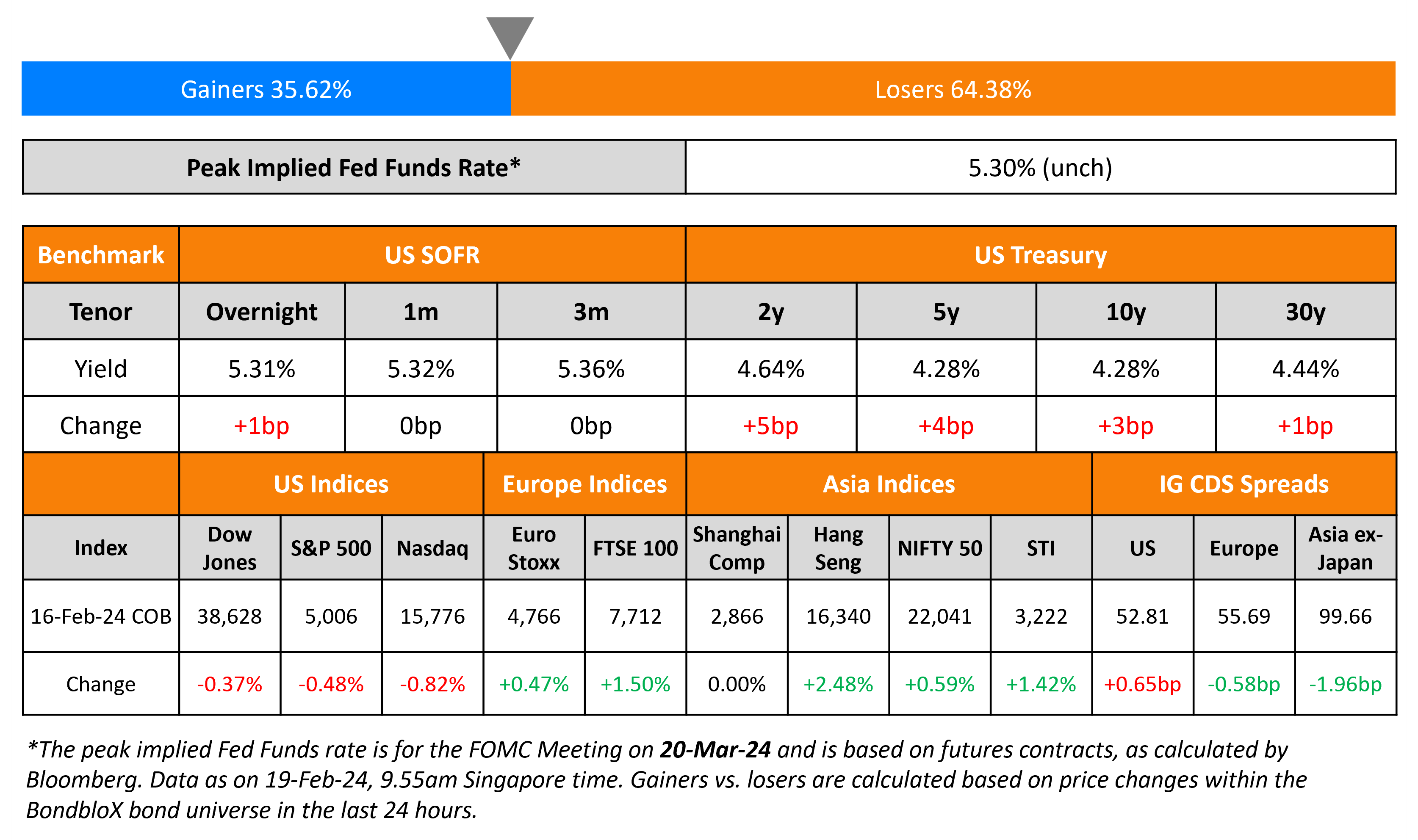 US Treasury yields ticked higher by 3-5bp on Friday. US PPI rose in January by more than forecast, thanks to a jump in costs of services. PPI for final demand increased rose 0.9% YoY and also exceeded forecasts of a 0.6% rise. Looking at credit markets, US IG and HY CDS spreads widened 0.7bp and 5bp respectively. S&P and Nasdaq fell 0.5-0.8%.