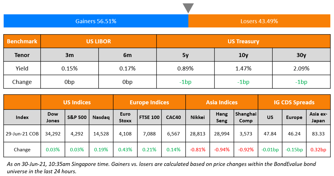 US markets ended slightly higher – Nasdaq up 0.2% and S&P largely flat. The Consumer Confidence index was up 7.3 points in June to 127.3, the highest reading since the start of the pandemic and well above the 119 market forecast. IT continued its upward rally and was up 0.7% while Energy and Communication were down 0.5%. US 10Y Treasury yields were slightly tighter at 1.47%. Euro zone consumer inflation expectations for June stood at 27.1, up 4.9 vs. May and economic sentiment rose 3.4 points MoM to 117.9 vs. estimates of 116.5. European markets notched modest gains – DAX up 0.9%, CAC up 0.2% and FTSE up 0.1%. US IG and HY CDS spreads were flat. EU main and crossover CDS tightened 0.2bp and 0.4bp respectively. Saudi TASI and Abu Dhabi’s ADX were up 0.4% and 0.2% respectively. Brazil’s Bovespa was marginally down 0.1%. Asian markets are slightly higher– Singapore’s STI up 0.9%, Shanghai and Nikkei up 0.1%. Asia ex-Japan CDS spreads were 0.3bp wider.