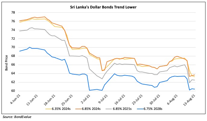 Sri Lanka’s dollar bonds have trended lower this week. While there is no clear reason for the fall, the fear of resurgence of the delta variant has the potential to delay the tourism recovery of the island nation, which relies on tourism for over 10% of its GDP (2019). The highly indebted nation has been hit hard by the pandemic and its foreign reserves have depleted 30% since the beginning of the year to $3.6bn as of end-June. Despite going through a rough patch, the nation has always repaid its debt on time, the latest being the repayment of its $1bn 6.25% 2021s last month. However, this would have also dented the already low forex reserves. The nation has managed its debt obligations by raising money through its bilateral ties with friendly nations including China, India and South Korea and its central bank had also revealed plans to raise $600mn-700mn through forex surrenders last month. The nation’s state minister for money and capital markets, Ajith Cabraal has reiterated on multiple occasions that the nation is committed to repaying its debt. These measures though need to be complemented by a reduction in its fiscal deficit. Due to the deteriorating financial position, the nation was put under review for downgrade by Moody’s on July 19 this year. It was downgraded to CCC+ by S&P, to CCC by Fitch and to Caa1 by Moody’s late last year.