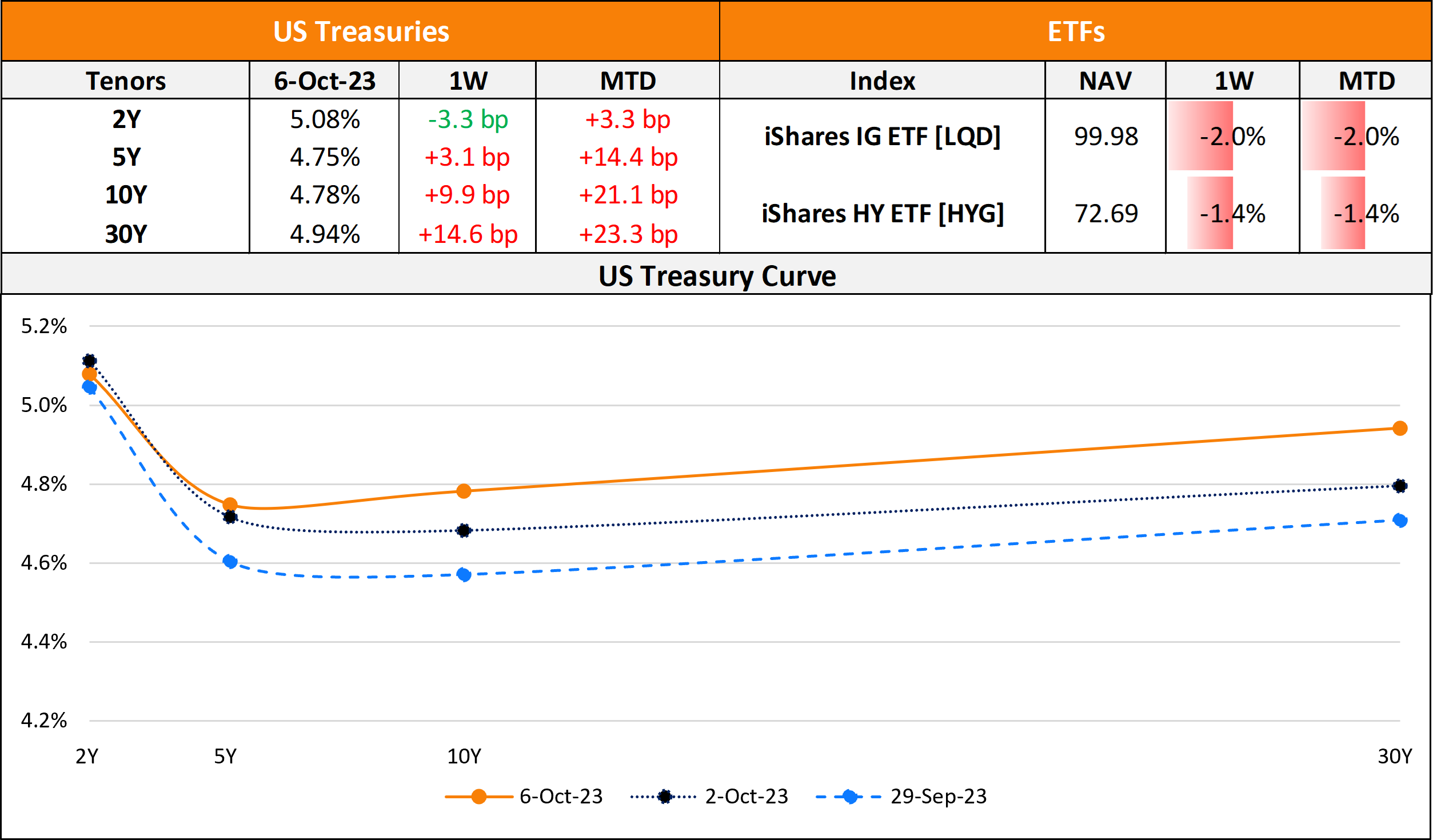 EU Corporate G3 issuances fell to $12.97bn vs. $29bn a week prior. Issuance volumes were led by Diageo’s $1.75bn two-trancher and Credit Agricole’s 1bn issuances. The region saw 27 upgrades and 55 downgrades across the three major rating agencies. The GCC dollar primary bond market saw $1.05bn in new deals after $2.5bn in deals a week prior with Emirates NBD and Damac raising $700mn and $350mn each. Across the Middle East/Africa region, there were 4 upgrades and no downgrades across the major rating agencies. LatAm saw $2.5bn in new deals after no new issuances a week ago. Volumes were led by Panama’s $1.4bn two-tranche deal and Guatemala’s $565mn issuance. The South American region saw 1 upgrades and 7 downgrades each across the rating agencies.