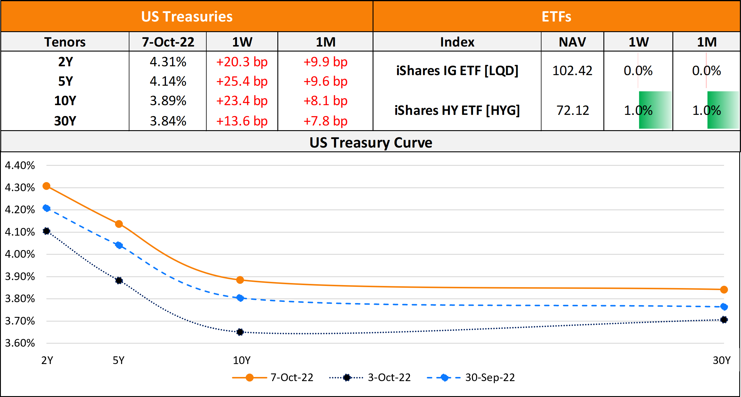 US primary market issuances saw an increase in new bond deals to $6.96bn vs. $1.7bn in the week prior. Of this, IG issuances stood at $6.65bn, led by General Motor’s $1.25bn deal and Cargill’s $1.25bn two-trancher. In North America, there were a total of 21 upgrades and 40 downgrades across the three major rating agencies last week. As per Lipper data, US IG funds saw a massive $3.54bn in outflows in the week ended October 5, a seventh straight week of outflows. On the other hand, HY funds saw $1.87bn in outflows. LatAm saw nil issuances last week. In South America, there was 1 upgrade and 2 downgrades across the major rating agencies. EU Corporate G3 issuance rose to $21.5bn vs. $13.8bn one week prior – Enel’s $3bn three-trancher and Caisse de Refinancement’s €1.8bn deal led the tables. Across the European region, there were 15 upgrades and 53 downgrades. The GCC G3 primary bond market saw $4bn in deals led by Saudi PIF’s $3bn three-trancher and First Abu Dhabi’s $700mn deals after two consecutive weeks of no deals. Across the Middle East/Africa region, there were 5 upgrades and 1 downgrade across the three major rating agencies. APAC ex-Japan G3 issuances were at $3.1bn vs. $1bn in the week prior led by Philippines’ $2bn three-trancher and DBS’s €750mn deals. In the APAC region, there was 1 upgrade and 13 downgrades combined across the three rating agencies last week.