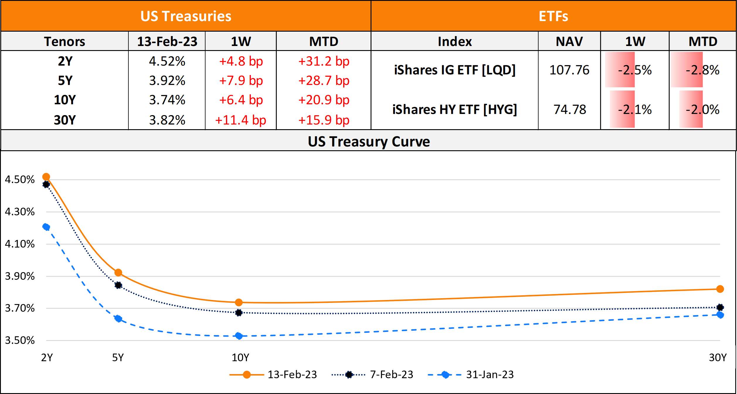 US primary market issuances stood at $37.4bn last week vs. $24.5bn a week prior. IG issuances stood at $29.8bn led by Intel’s $11bn jumbo seven-part deal and NextEra Energy’s $2.4bn two-tranchers each. HY issuances stood at $7.6bn led by Alliant Holdings’ $1.25bn deal and TransDigm’s $1bn deal. In North America, there were a total of 50 upgrades and 57downgrades across the three major rating agencies last week. As per Lipper data, US IG bond funds saw inflows of $2.8bn in the week ending February 8 as compared to two straight weeks of outflows totaling $3.9bn. HY bond funds saw $871.3mn of inflows during the week following the prior week’s $1.28bn in outflows. Looking at CDS spreads, credit spreads have widened during the past week after having been at its tightest levels in over a month during the beginning of last week.