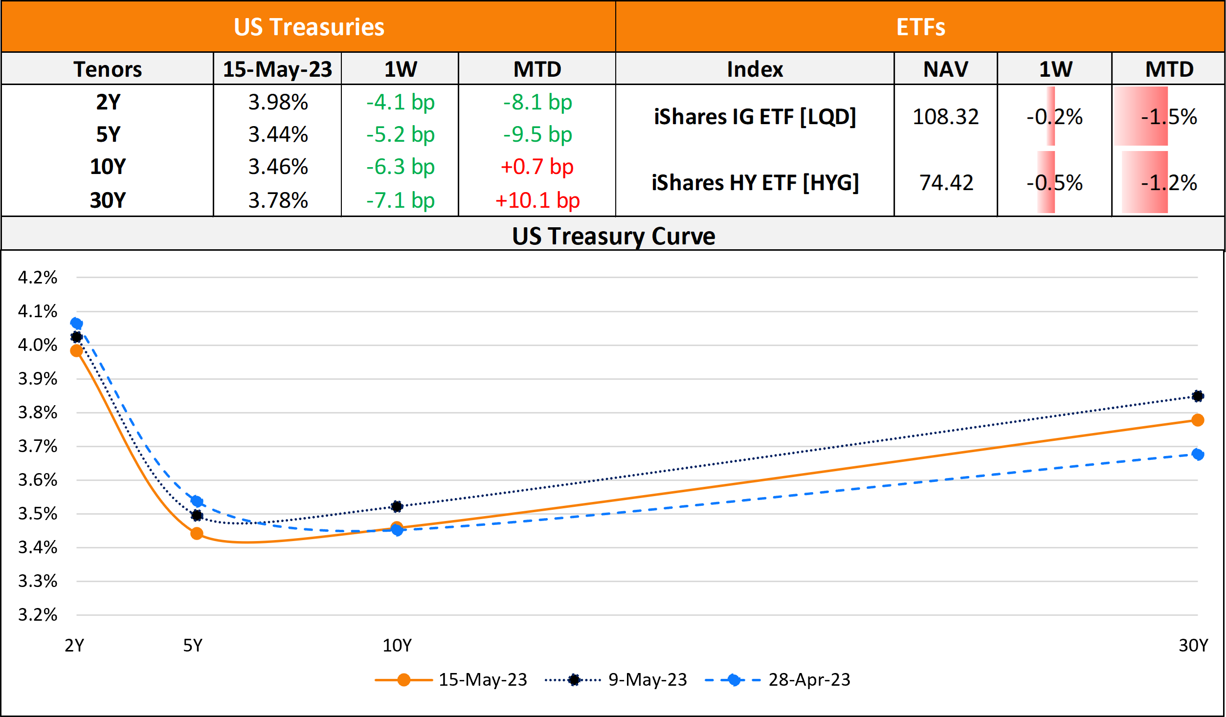 US primary markets saw $37.5bn in new deals last week as compared to $35.4bn in deals a week prior to it. Of the deal volumes, IG issuers raised $33.8bn in new issuances led by Merck’s $6bn six-trancher and Apple’s $5.5bn five-trancher. HY saw $3.7bn in new deals with Iron Mountain and Ball’s $1bn deals each. In North America, there were a total of 36 upgrades and 33 downgrades across the three major rating agencies last week. US IG bond funds saw $1.43bn in a second week of inflows, adding to $321.6mn in inflows from the prior week. For the week ended May 10, HY funds saw $1.2bn in outflows, a second straight weeks of outflows following the prior week’s $1.58bn.