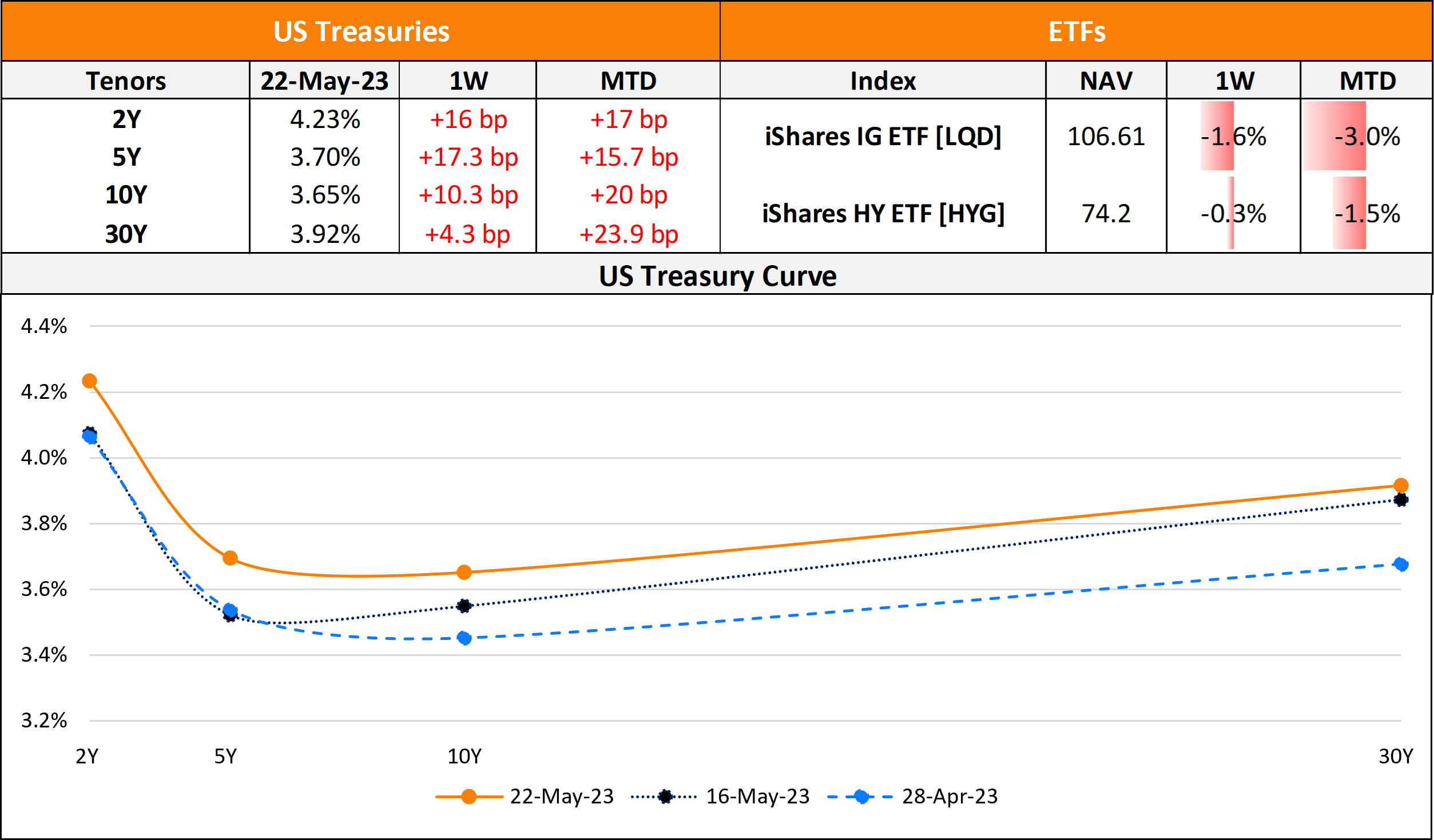US primary markets saw a near doubling in new deals last week at $64.8bn as compared to $37.5bn in deals a week prior to it. This was largely attributed to Pfizer’s jumbo $31bn eight-tranche issuance, the fourth largest bond deal ever, to finance a portion of its Seagen merger. Other notable IG deals, which accounted for $59bn of issuance, include Charles Schwab’s $2.5bn and State Street’s $2bn two-part deals each. HY saw $6.1bn in new deals led by Venture Global raising $4bn followed by Curo Group’s $682mn deal. In North America, there were a total of 45 upgrades and 64 downgrades across the three major rating agencies last week. US IG bond funds saw $2.16bn in a third straight week of inflows for the week ended May 17, adding to $1.43bn in inflows from the prior week. HY funds on the other hand witnessed $1.15bn in outflows, a third straight weeks of outflows following the prior week’s $1.2bn.