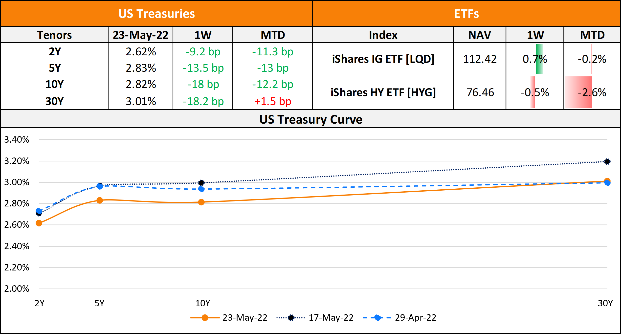 US primary market issuances last week were at $28.8bn vs. $19bn in the week prior with Investment grade (IG) corporates issuing $27.6bn of deals while high yield (HY) issuances were at only $1bn. The largest IG deals included Citi raising $6bn, UnitedHealth raising $4bn and PayPal raising $3bn via four-part deals each. In the HY space, Carnival Corp was the sole issuer raising $1bn via an 8NC3 at 10.5%. In North America, there were a total of 35 upgrades and 30 downgrades combined across the three major rating agencies last week. LatAm saw no issuances vs. $900mn in issuances in the prior week. In South America, there were 5 upgrades and 4 downgrades across the major rating agencies. EU Corporate G3 issuances rose sharply to $40bn vs. $16.6bn in the week prior, led by banks – Banco Santander raised $2.15bn via a two-trancher, BNP Paribas and SocGen raised €1.5bn each while BBVA raised €1.25bn. Across the European region, there were 9 upgrades and 34 downgrades across the three major rating agencies. Credit Suisse and its related entities made up 14 of the downgrades while Ukraine’s sovereign bonds accounted for 6 of the downgrades. The GCC G3 region saw no new deals last week for a fourth consecutive week. Across the Middle East/Africa region, there was 1 upgrade and no downgrades across the three major rating agencies. The APAC ex-Japan G3 region saw $7.7bn vs. $3.4bn in issuances in the week prior led by Westpac’s $2.25bn three-trancher, Commonwealth Bank’s $1.75bn issuance and EXIM Bank of Korea’s $1bn deal. In the APAC region, there were 2 upgrades and 28 downgrades combined across the three major rating agencies last week.