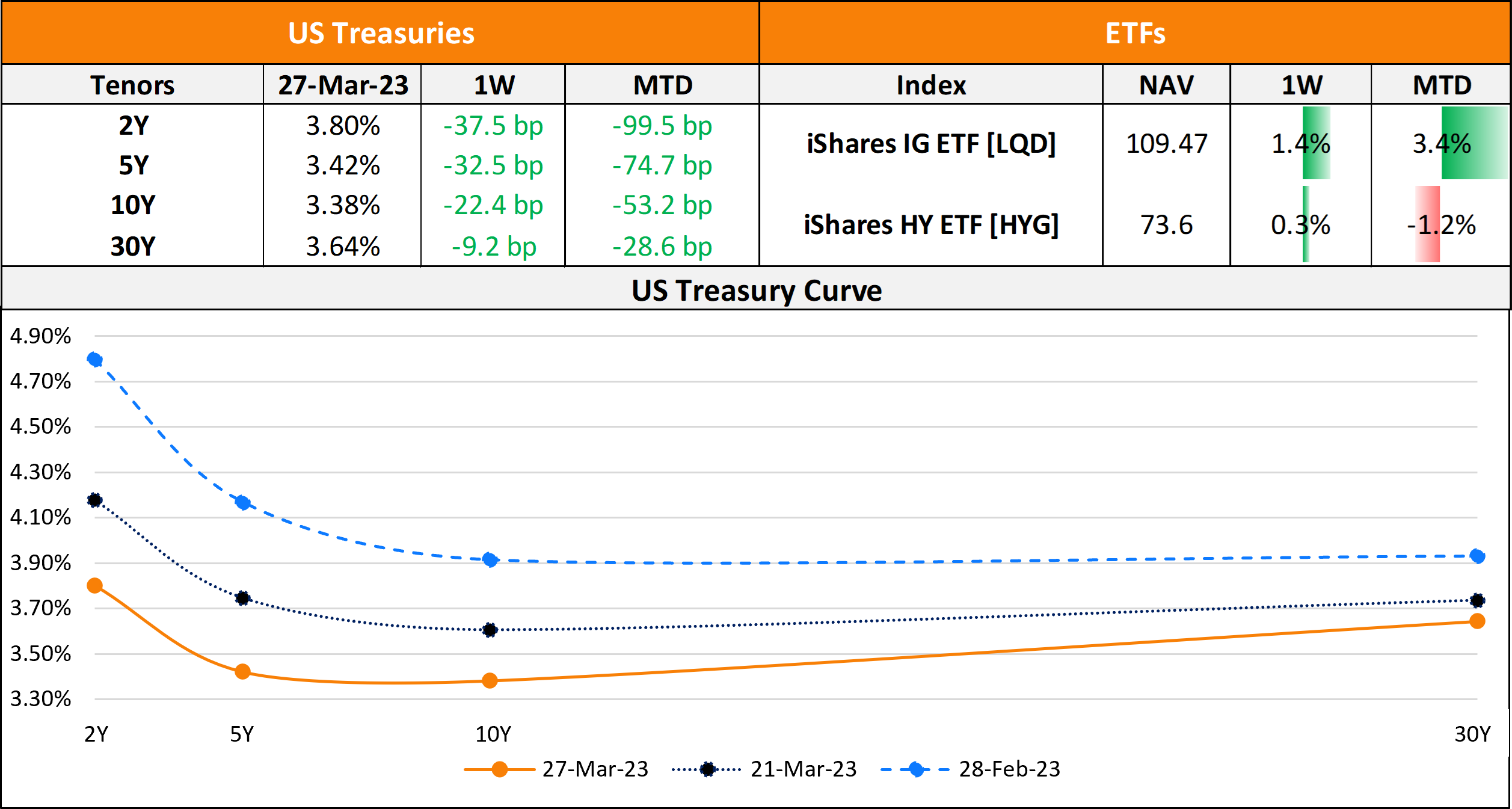 US primary market saw $19.9bn in new deals last week as compared to no new deals a week prior. The deal volumes were fully taken up by IG issuers led by UnitedHealth’s $6.5bn four-trancher and Medtronic’s $2bn two-trancher. In North America, there were a total of 32 upgrades and downgrades each across the three major rating agencies last week. US IG bond funds saw $865mn in outflows for the week ended March 22 after $3.89bn was withdrawn in the week prior to it. HY funds saw $902mn in outflows adding to the $1.43bn withdrawal the week before. As per EPFR, over $286bn in funds have gone into money market funds (MM Funds) this month, the biggest month of inflows since the depths of the Covid-19 crisis as noted by them. This move underscores the impact of the Credit Suisse induced volatility where investors would prefer low-risk assets like MM funds that are easy to liquidate and hold government T-bills.