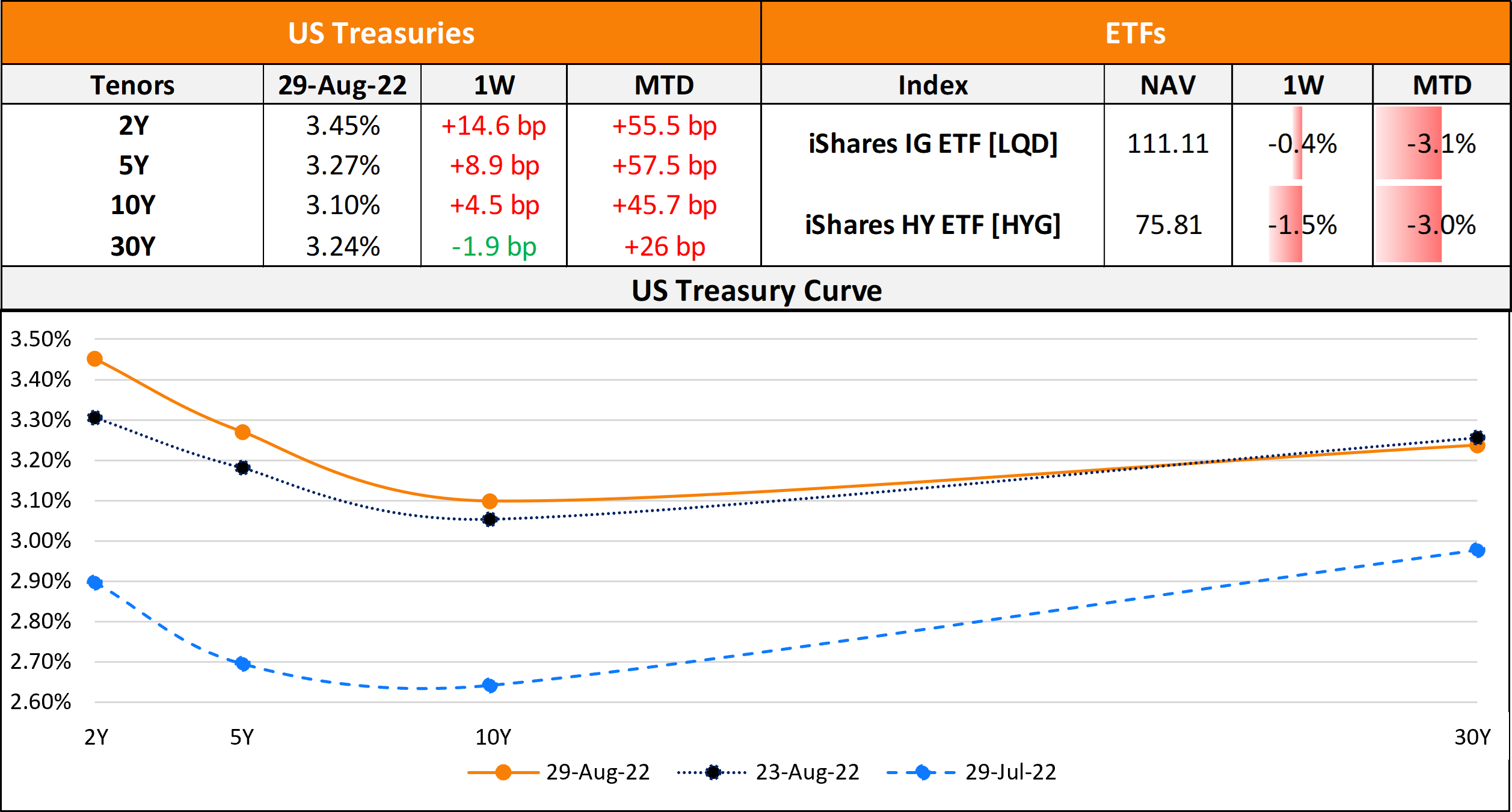 US primary market issuances saw a massive drop last week to just $2.4bn vs. $22.1bn in the week prior. IG issuances stood at $1.6bn vs. $16.4bn the week prior, led by MassMutual’s $600mn deal and Pricoa’s $350mn issuance. In the HY space, there were no new bond deals as compared to $5.2bn in the week prior. The remaining $800mn in deals were from unrated issuances. In North America, there were a total of 21 upgrades and 34 downgrades across the three major rating agencies last week. As per Lipper data, US IG funds saw $806mn in outflows in the week ended 26 August, after three consecutive weeks of inflows. HY funds saw even larger outflows at $4.6bn. In the LatAm region, there were no new issuances vs. $340mn in the week prior. In South America, there were 2 upgrades and 3 downgrades across the major rating agencies. EU Corporate G3 issuance fell to $22bn vs. $32bn one week prior – Palladium Global’s $3.25bn deal led the table, followed by Deutsche Bank and BNP Paribas raising €1.5bn each. Across the European region, there were 12 upgrades and 20 downgrades. The GCC G3 primary bond market saw $368mn in issuances with First Abu Dhabi Bank raising the entire amount. This was the first issuance from the region over the last six weeks. Across the Middle East/Africa region, there were 6 upgrades and 4 downgrades across the three major rating agencies. APAC ex-Japan G3 region issuances rose to $1.7bn vs. $200mn in the week prior with NAB raising €750mn, followed by Zhengzhou Urban’s $350mn deal. In the APAC region, there were 2 upgrades and 9 downgrades combined across the three rating agencies last week.