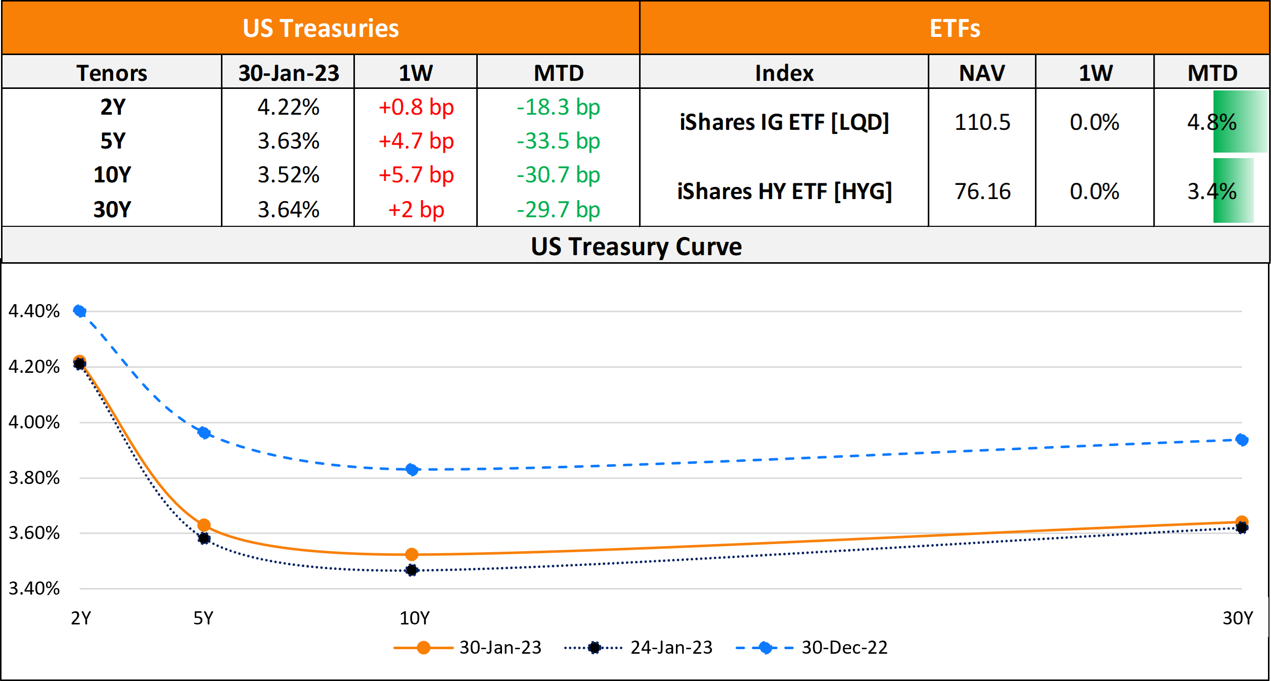 US primary market issuances stood at $27.7bn last week vs. $19.4bn a week prior. IG issuances stood at $23.2bn led by US Bancorp’s $3.65bn and Truist Financial’s $3bn two-trancher issuances each. HY issuances stood at $2.9bn led by Caesar Entertainment’s $2bn issuance and Cooper Standard’s 580mn deals. In North America, there were a total of 25 upgrades and 29 downgrades across the three major rating agencies last week. As per Lipper data, US IG bond funds saw inflows of $3.3bn for the week ended January 25, following $3bn of inflows in the week prior. HY bond funds saw $1.3bn of outflows in the week ending January 25.