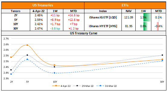 US primary market issuances fell to $25bn vs. $32bn in the week prior. Investment grade (IG) corporates once again took the chunk of issuances, with $20bn of deals while high yield (HY) issuance stood at $3bn. The largest IG deals were led by Corebridge Financial’s $6bn five-trancher and HP’s $2bn dual-trancher. In the HY space, Novolex raised $1.61bn via a two-tranche, followed by CDI’s $1.2bn issuance. In North America, there were a total of 20 upgrades and 25 downgrades combined across the three major rating agencies last week. LatAm saw $1bn in issuances last week with America Movil being the sole issuer as compared to nil in the prior week. In South America, there was 4 upgrades and 1 downgrade across the major rating agencies. EU Corporate G3 issuances stood at $31.4bn vs. $47bn in the week prior, led by the Santander UK’s €1.75bn deal and BNP Paribas’ €1.5bn issuance. Across the European region, there were 19 upgrades and 137 downgrades across the three major rating agencies, with the majority of the latter coming from Russian corporates. The GCC G3 region saw $1.3bn vs. $3bn in issuances in the week, led by Sharjah’s $750mn sukuk and FAB’s €500mn deal. Across the Middle East/Africa region, there were 2 upgrades and 2 downgrades across the three major rating agencies. APAC ex-Japan G3 issuances stood at $7.9bn vs. $8.6bn in the week before. This was led by UOB’s $2.1bn three-trancher, Westpac’s €1bn deal and Greenko’s $750mn deals. In the APAC region, there were 2 upgrades and 17 downgrades combined across the three major rating agencies last week.