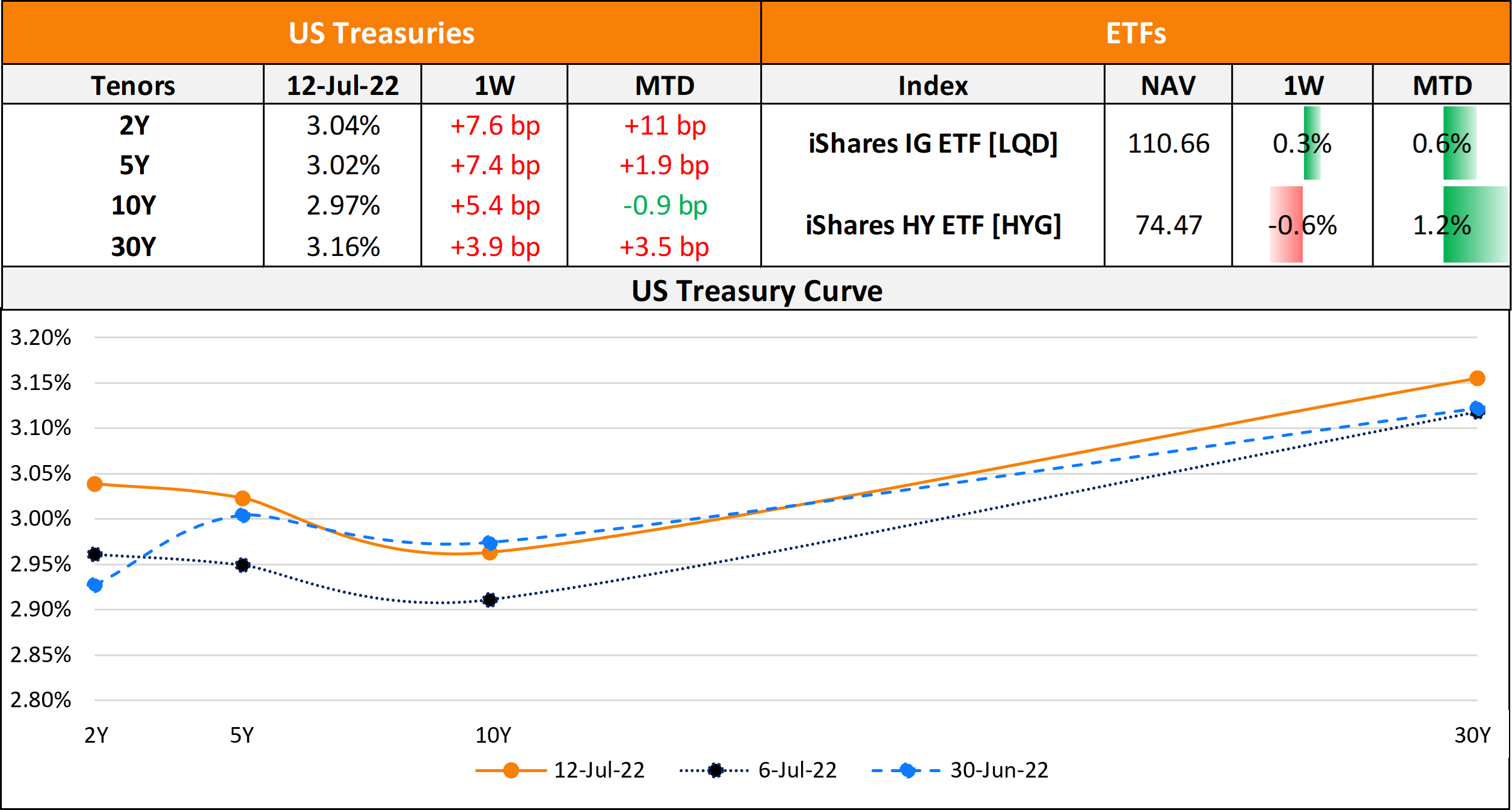 US primary market issuances stood at $11.95bn vs. $6.1bn in the week prior. Of this, IG issuances were at $11.6bn vs. $4.7bn in the week prior led by Celanese Holdings’ $6.5bn four-trancher and Fidelty Information’s $2.5bn four trancher. HY issuances were at $350mn vs. $450mn in the week before, coming from a single deal by Garden Spinco, a wholly-owned subsidiary of 3M. In North America, there were a total of 16 upgrades and 19 downgrades combined across the three major rating agencies last week. US IG funds saw $5.8bn in outflows in the week ended July 8 as per Lipper data, following an outflow of $5.2bn in the week prior. Bloomberg notes that investors are continuing to exit IG bond funds, lengthening the longest losing streak on record to fifteen consecutive weeks. The total amount of withdrawals during this stretch has now reached $65bn. HY funds meanwhile saw inflows of $889mn vs. $1.6bn in outflows in the week before. LatAm saw $340mn in deals last week after $200mn in the week prior, with Ecuador DPR raising $300mn. In South America, there were no upgrades and 2 downgrades across the major rating agencies. EU Corporate G3 issuance rose to $17bn vs. $12.7bn in the week prior – Banca Nazionale del Lavoro raising €3.75bn followed by KFW and Credit Agricole raising €1bn each. Across the European region, there were 9 upgrades and 35 downgrades across the three major rating agencies. The GCC G3 region saw $1.1bn in deals vs. $4bn in the week prior, led by First Abu Dhabi Bank and Emirates NBD raising $300mn and $175mn respectively. Across the Middle East/Africa region, there were no upgrades and 3 downgrades across the three major rating agencies. The APAC ex-Japan G3 region saw $2.8bn worth of new deals vs. $2.3bn in the week prior – Westpac raised €750mn, followed by Korea Gas raising $500mn and Shanghai Pudong Development Bank raising $400mn. In the APAC region, there were 4 upgrades and 17 downgrades combined across the three major rating agencies last week.