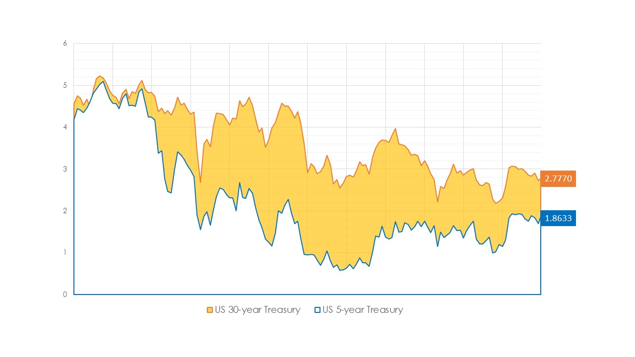 Treasuries continues to edge lower, led by the 5-year and 10-year yields which saw both saw a 10bp increase from the start of last week. 30-year yields have been left pretty much unchanged, producing the flattest levels of 5s30s since 2007. 5s30s refer to the spread between the 5-year yields and 30-year yields of a benchmark (say US Treasuries). According to Bloomberg Data, 5s30s are currently at 91.36, which puts it at 10-year lows. Essentially, tightening spreads for 5s30s suggests lesser difference in holding a longer tenor benchmark rate (30-year) versus a shorter one (5-year).
