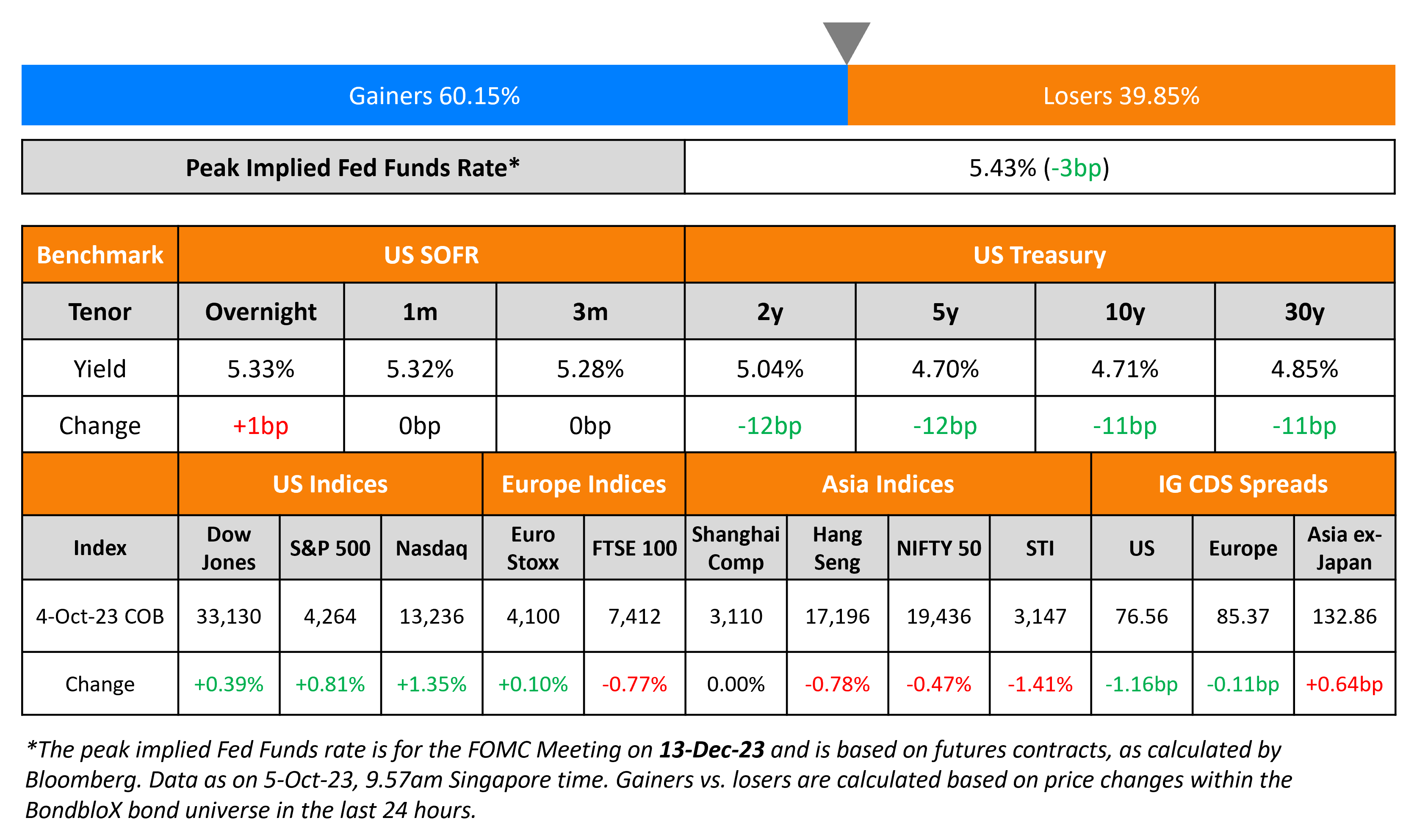 On Wednesday, US Treasuries reversed the sell-off seen a day prior as yields dropped by 11-12bp across the curve on the back of soft data. US ADP payrolls rose by only 89k in September, far below expectations of a 150k print and the lowest since January 2021. The ADP report also said that annual wage growth slowed to 5.9%, the twelfth consecutive monthly decline. However, it is to be noted that the ADP numbers can differ significantly from the NFP print later on Friday that is expected at 170k. Also, the US services sector grew albeit at a slowing pace as the ISM Non-Manufacturing PMI came at 53.6 in September vs. 54.5 in August. In credit markets, US IG CDS spreads were 1.2bp tighter while HY spreads tightened 7.7bp. US equities were higher with the S&P and Nasdaq up 0.8% and 1.4% respectively.
