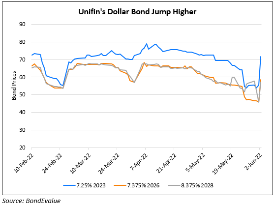 Dollar bonds of Unifin Financiera jumped over 20% yesterday after news that it received a $500mn equivalent credit line in pesos from Credit Suisse. Also, the Mexican company is said to be finalizing an agreement with bondholders to extend the maturity of its 7% bonds due August 2022 notes to May 2024. The credit line consists of $300mn in a term loan and $200mn in a revolving loan. The positive update comes just days after its dollar bonds fell 5-8 points on reports that the company was yet to follow up on plans to boost its liquidity.