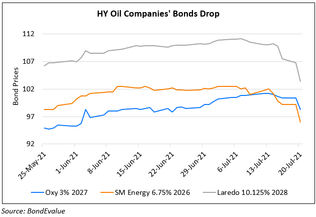 Bonds of US high yield oil companies dropped with the likes of Occidental (Oxy), Laredo Petroleum, SM Energy and Northern Oil falling ~3%. The move in bonds happened after the OPEC+ members agreed to boost production which saw Brent Crude fall below $70/bbl for the first time since last month, currently at $68.6/bbl. The OPEC+ reached a deal over the weekend to allow monthly production increases of 400,000 barrels a day from August after the UAE and Saudi Arabia ended their standoff. Analysts say this can ease the supply squeeze in the market and reduce inflationary risks driven by a spike in oil prices.