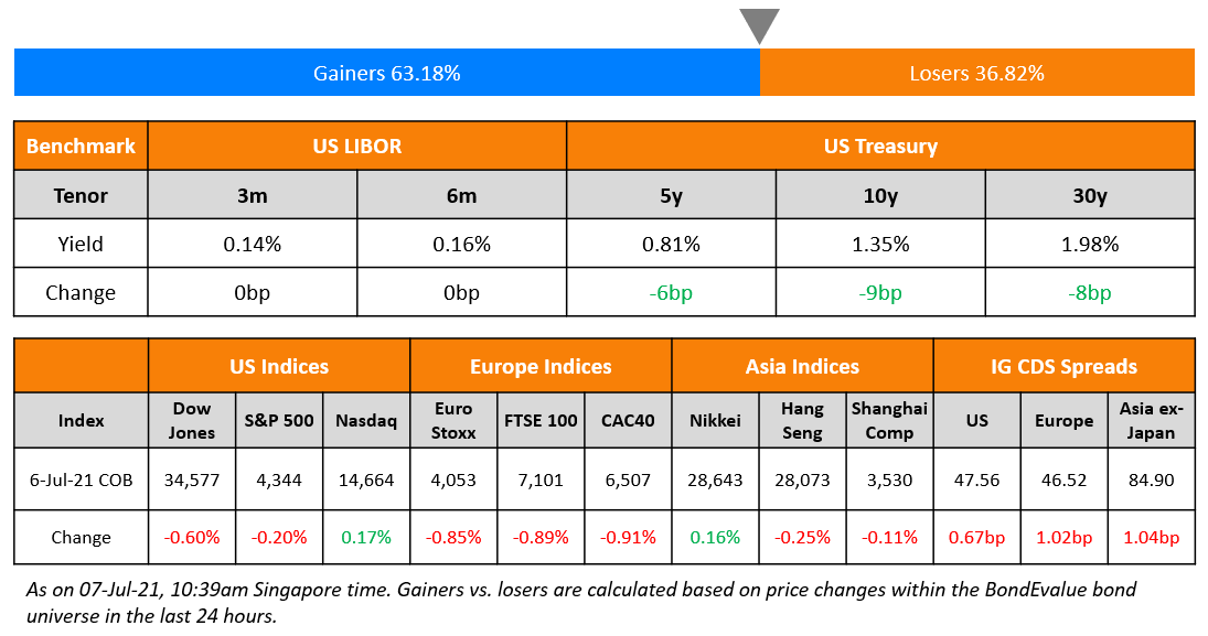 US Markets were mixed as the S&P was down 0.2%, snapping its 7-day winning streak while NASDAQ, was up 0.2%, at a new record. The June ISM Services index in the US dropped to 60.1 from May’s record high of 64.0 and lower than the forecasted 63.5. US business output continued to expand at the third-fastest rate since October 2009. Real Estate, Consumer Discretionary and IT were up 0.9%, 0.8% and 0.4%, pulling the bourses up while Energy, Financials and Materials down 3.2%, 1.6% and 1.4% pushed them lower. US 10Y Treasury yields dipped 9bp to a four month low of 1.35%. Eurostat eurozone retail sales rose by more than expected in May. However, German economic sentiment hit its lowest since January, with the ZEW survey at 63.3 in July, lower than the forecasted 75.2. European markets slid across – DAX, FTSE and CAC were down ~1.0%. US IG and HY CDS spreads widened 0.7bp and 4.3bp respectively. EU main and crossover CDS widened 1bp and 6.6bp respectively. Saudi TASI and Abu Dhabi’s ADX were down 0.3% and 0.2% respectively. Brazil’s Bovespa was down 1.4% higher. Asian markets opened in the red – HSI, Singapore’s STI and Nikkei were down 1.1%, 0.9% and 0.8% while Shanghai was largely flat. Asia ex-Japan CDS spreads were 1bp wider. Chinese property developers’ bonds, including Evergrande, Risesun, Kaisa and Sunac witnessed a sharp fall late on Tuesday. Sri Lanka’s bonds also made it to the losers list on the overall risk-off sentiment.